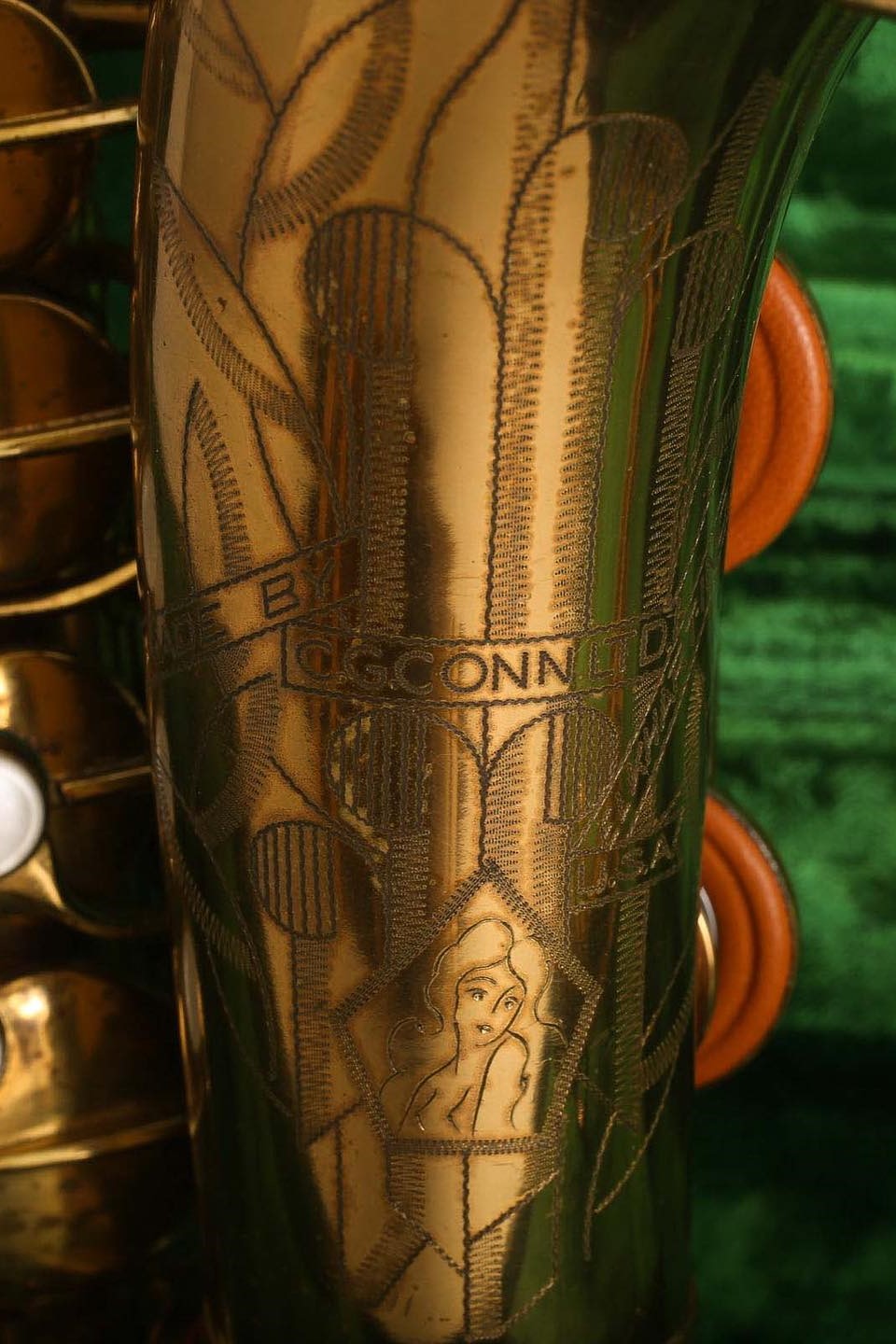 By the 250,000s the now well-known version of the Naked Lady appears, leaving behind heavily geometric Art Deco for the engraving pattern that would become synonomous with Conn for decades to come.